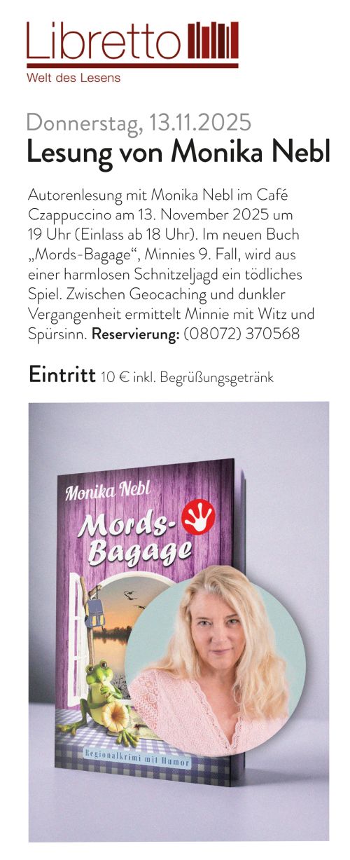 13. November 2025: Zum Jubiläum der Buchhandlung Libretto in Haag sind die Minnie und ich dann im Czappuccino in Haag zu finden. Karten gibt es bei der Buchhandlung Libretto unter Tel. 08072/370568.