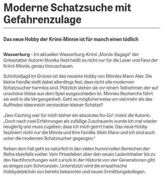 OVB Heimatzeitungen November 2021Buchvorstellung (bei Radio Regenbogen): "Mords-Kaliber: Krimi-Minnies zweiter Fall" (Juli 2021)